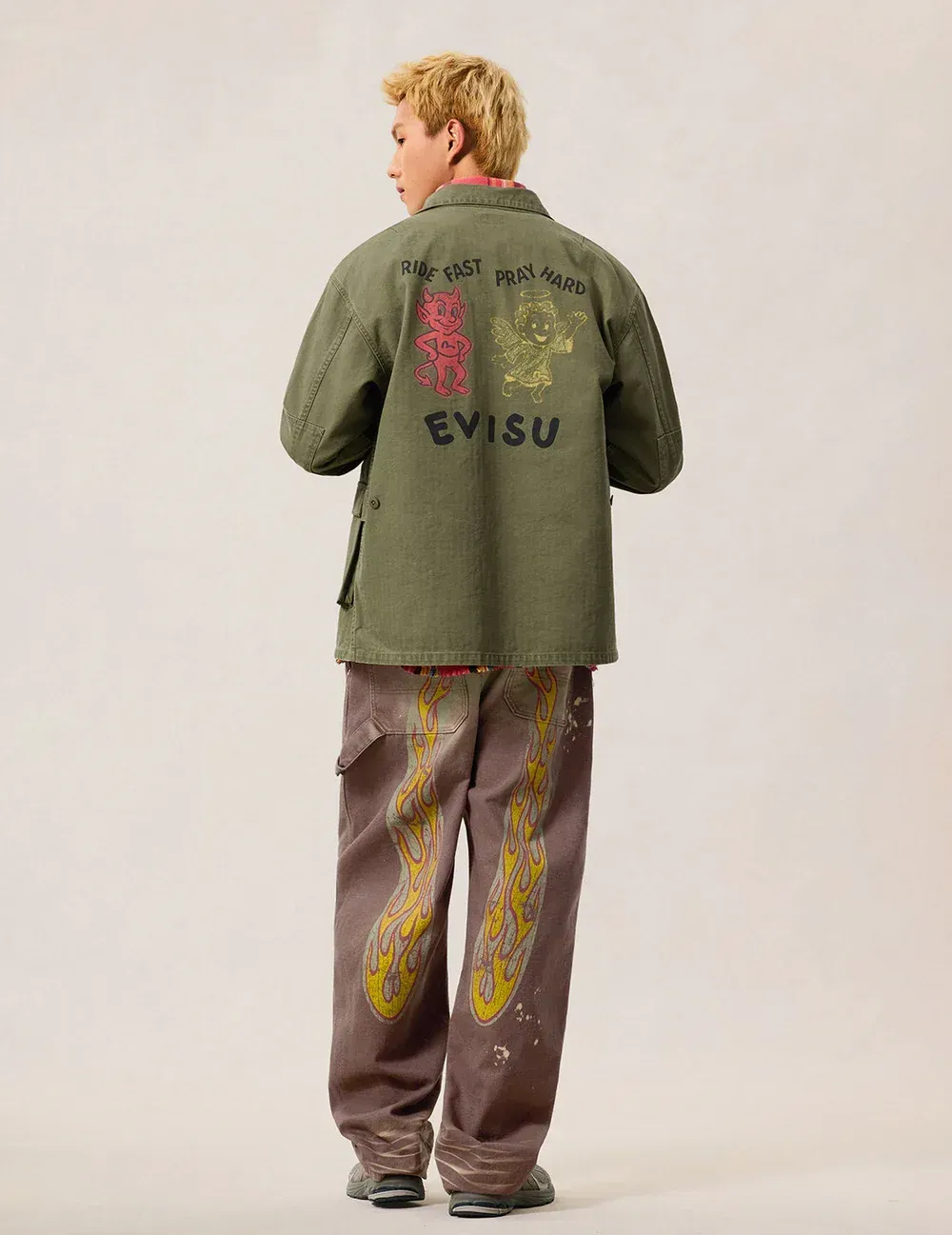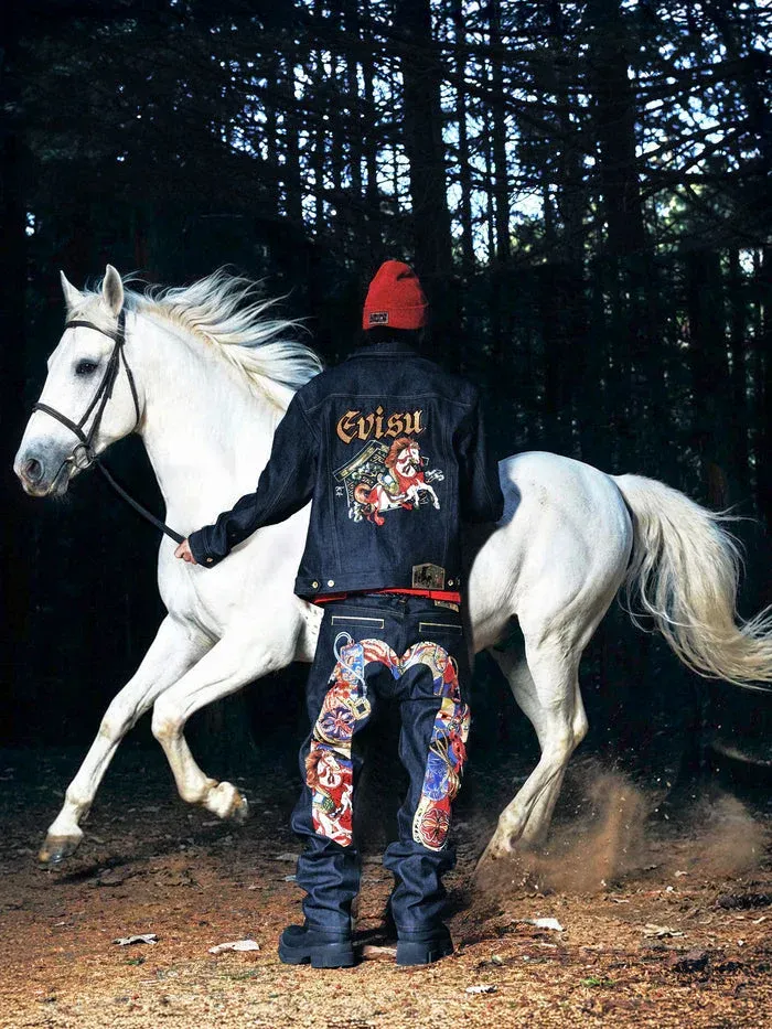 This #denim shirt #jacket showcases EVISU's exquisite #craftsmanship with its unique playful theme and rich #embroidery elements. The jacket is adorned with a variety of embroidered patterns, including the #Godhead, #Seagull, and #Kamon, reflecting the brand's classic features and cultural significance while enhancing visual appeal and creativity.
